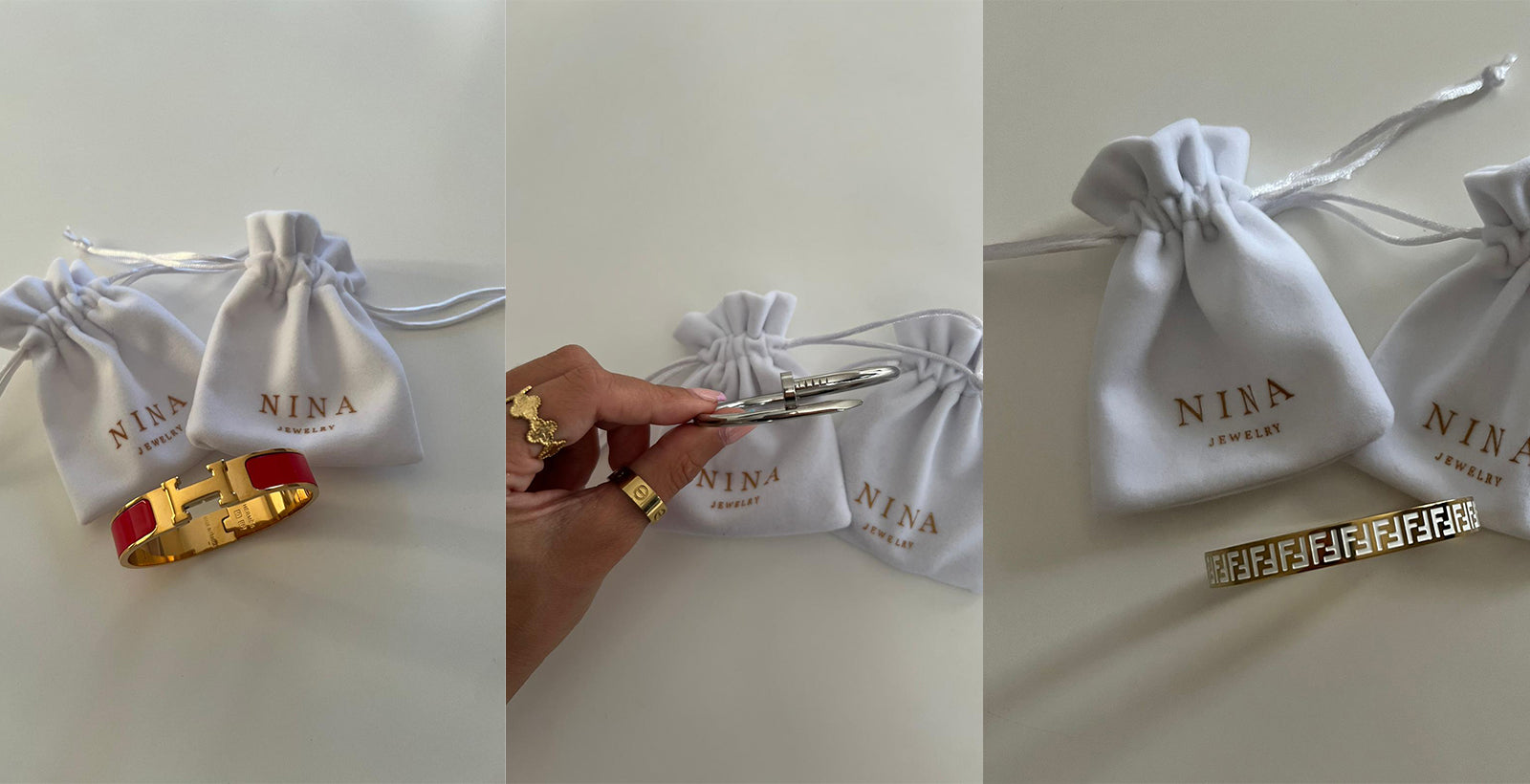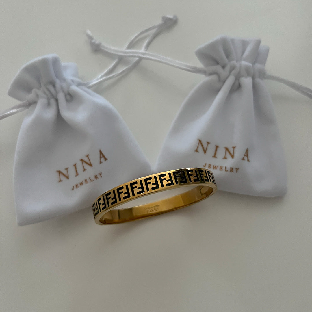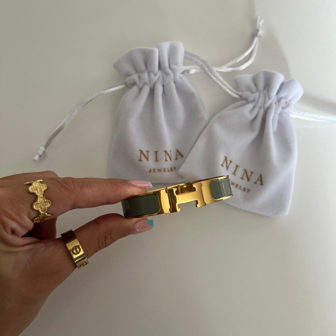 Chez Nina, nous utilisons des matériaux de haute qualité, principalement de l'or et de l'argent, pour la confection de nos bracelets. Certains modèles incluent également des combinaisons de couleurs vibrantes, comme le rouge, le vert, le noir, et d'autres nuances, pour un style unique et r